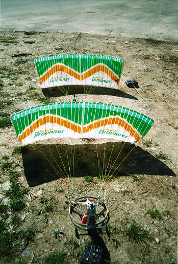 Photos n°12Paramoteur ready-to-fly. A mettre entre toutes les mains et à toujours avoir avec soi dans le coffre de la voiture !!! Voile en feuille plastique avec nervures mousse, chassis en plastique, radio 2 voies (direction+moteur), moteur type speed 280, envergure 1200mm