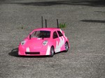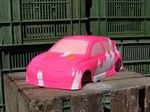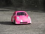 Comme je ne souhaite pas abimer la carosserie d'origine (que je préparerai trenquillement plus tard), j'ai acquis une carrosserie de Nissan Micra toute "mignone", que j'ai légèrement modifié pour lui ôter le côté "course". Je me suis amusé à la peindre en rose pour accentuer son côté "mignon".