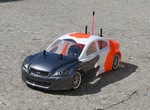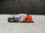 C'est une carrosserie Tansou de Proline Racing, peinte avec les Tamiya PS23 (gris foncé), PS24 (orange) et PS1 (blanc).